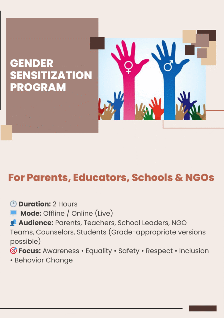 Gender sensitization programs help individuals and communities challenge biases, build empathy, and understand respectful boundaries and rights. Through dialogue and reflection, these programs promote safety, equity, and dignity for all. When families, schools, and workplaces become informed and sensitive, we move closer to building a society that is safe, just, and empowering for every gender.