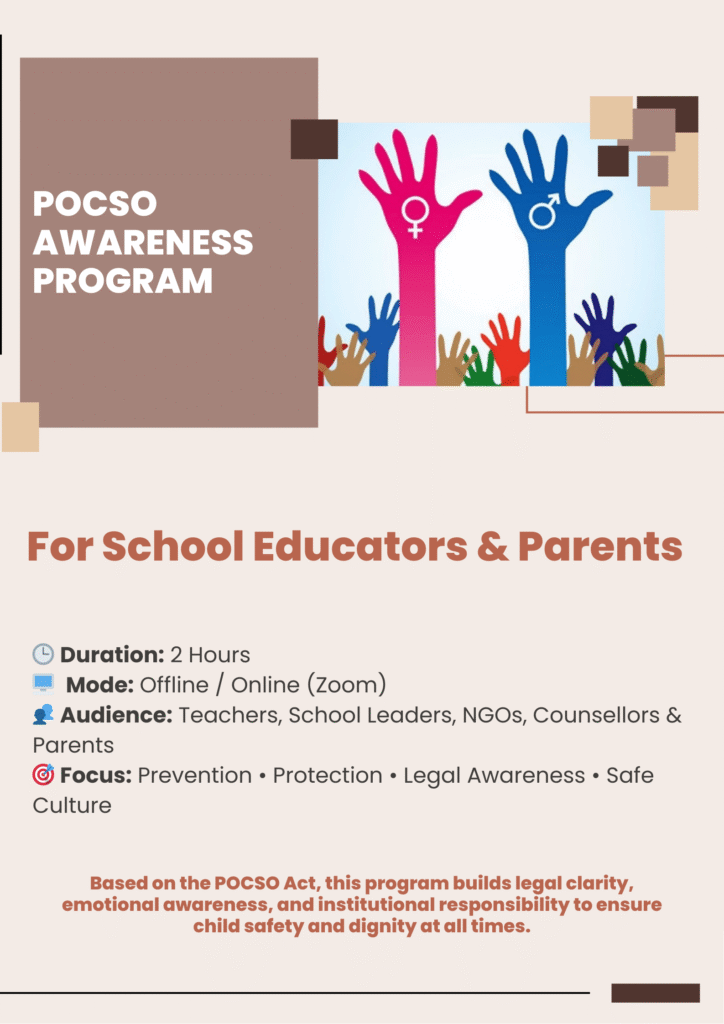 Awareness of the POCSO Act empowers parents, educators, and communities to identify early signs of abuse and respond correctly. It encourages open conversations, reduces stigma, and helps children understand personal boundaries in age-appropriate ways. For schools and institutions, POCSO awareness strengthens their safety protocols and builds trust with families. When communities are informed, children are safer, more confident, and less vulnerable to exploitation.
